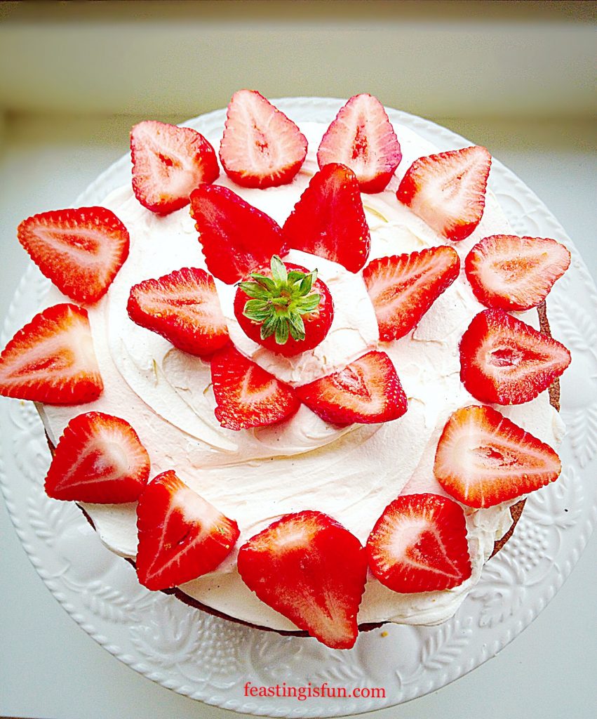 Because this cake is so easy to make and looks so beautiful, it easily turns any occasion into a Feast! Since I found strawberries on special offer I baked this cake. Because, they were so sumptuous they deserved celebrating!
