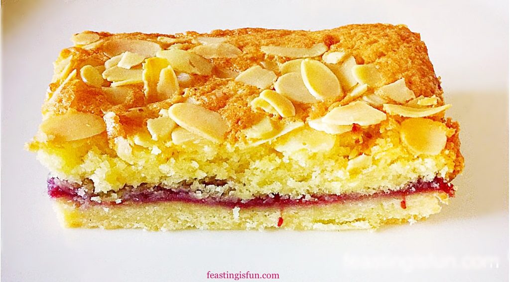 While the buttery shortbread base gives these Bakewell Shortbread Bars a sturdiness that is needed when food is to be transported. Topped with delicious raspberry jam, giving a hint of tart sweetness and then covered in a light, tender almond sponge with flaked almonds added for crunch, flavour and decoration.