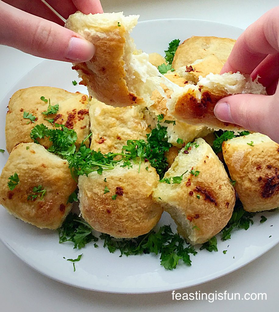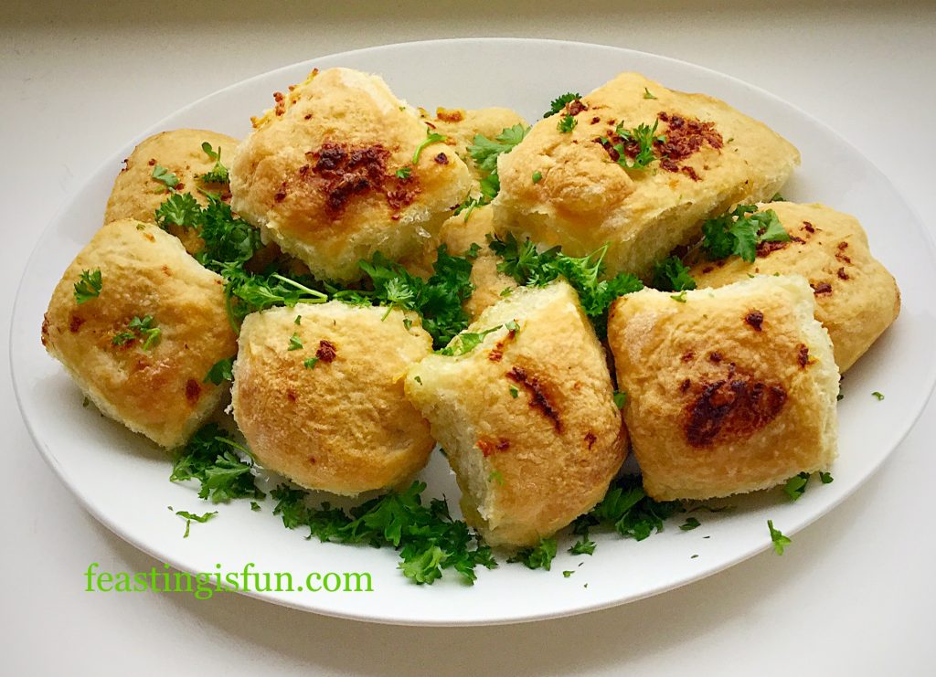- When baked remove the tray from the oven and immediately transfer the individual Garlic Cheese Bombs to a serving platter. Be careful as they will be very hot.