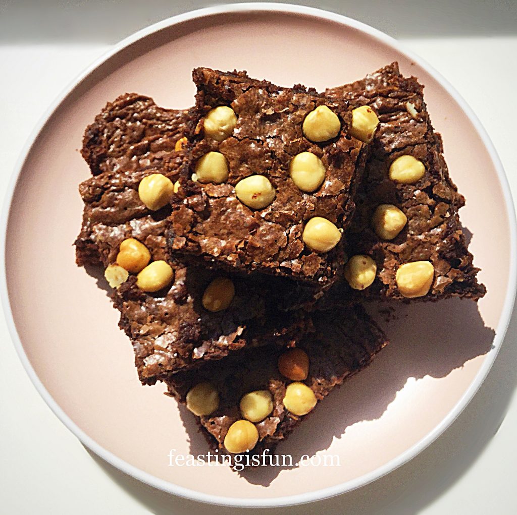 Since eating a brownie is an indulgence, it makes sense to eat only the best. Made using 400 grams of good quality chocolate, dark, treacly sugar and aromatic vanilla extract, the basic brownie is already exceptional. In addition, by adding roasted, chopped hazelnuts to the brownie batter, not only does the flavour resemble Nutella, the hazelnuts add crunch to the texture. Finally, whole hazelnuts, roasted during the baking process, completes the exceptional flavour profile.