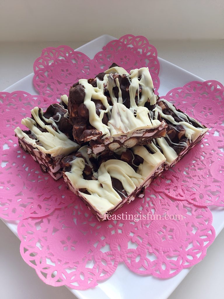 - Using a spoon, drizzle the white chocolate over the rocky road mixture in the tin.