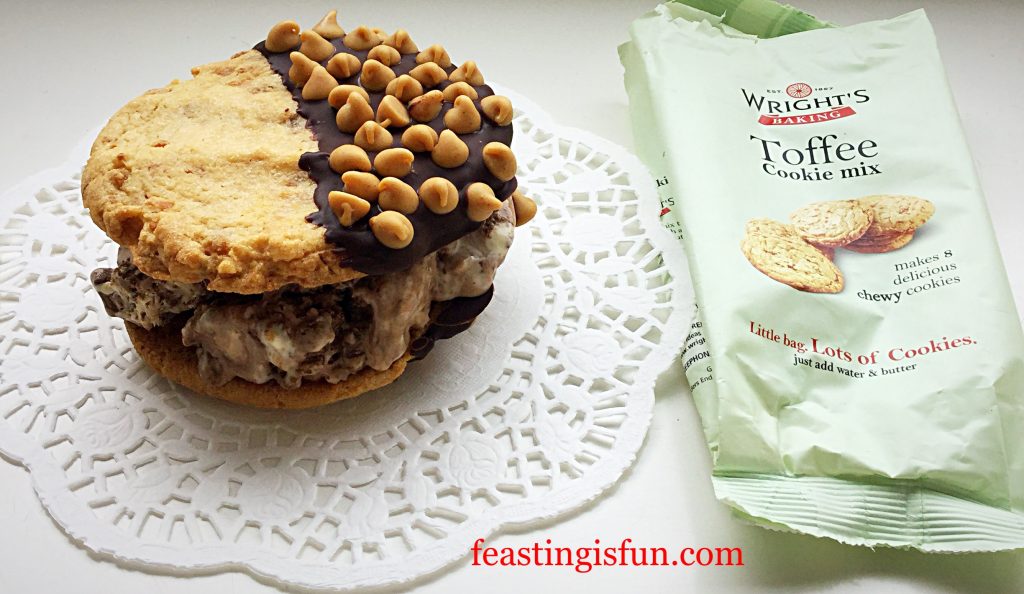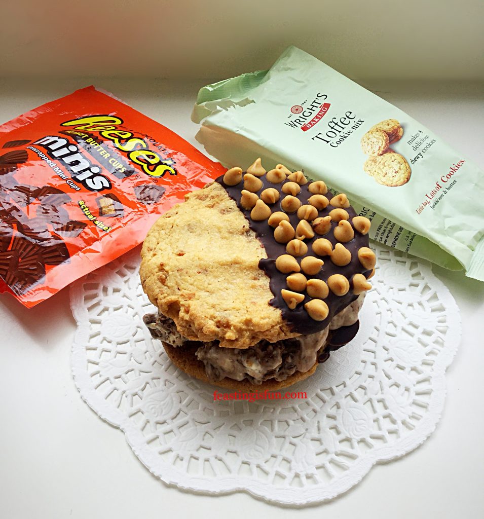 Finally, complimenting such a flavour punched ice cream are my Caramac Caramel Cookies. Since a large, robust Cookie is the only way to go when sandwiching chunks of peanut butter cup ice cream. And because these cookies are double their usual size, they are perfect for creating an ice cream sandwich.