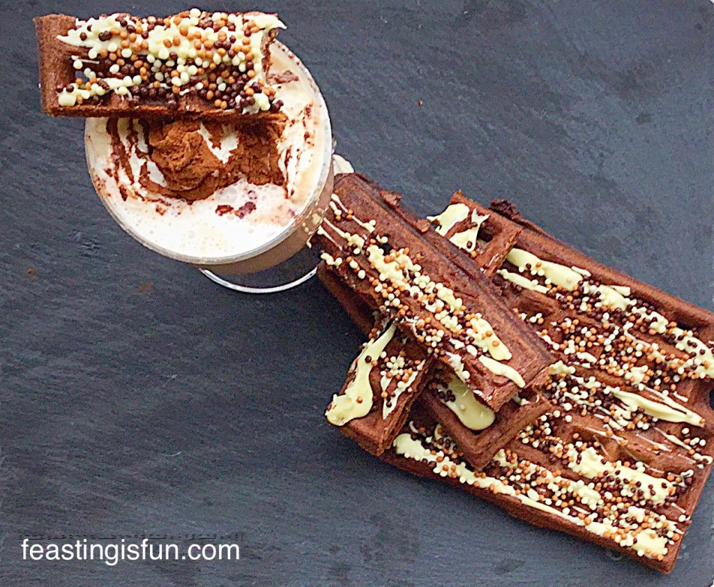 These Chocolate Dunking Waffles have a deep chocolate flavour and an almost fudgey, brownie like consistency. And they are incredibly more-ish. You don’t have to worry though, as each waffle is cut into four fingers.