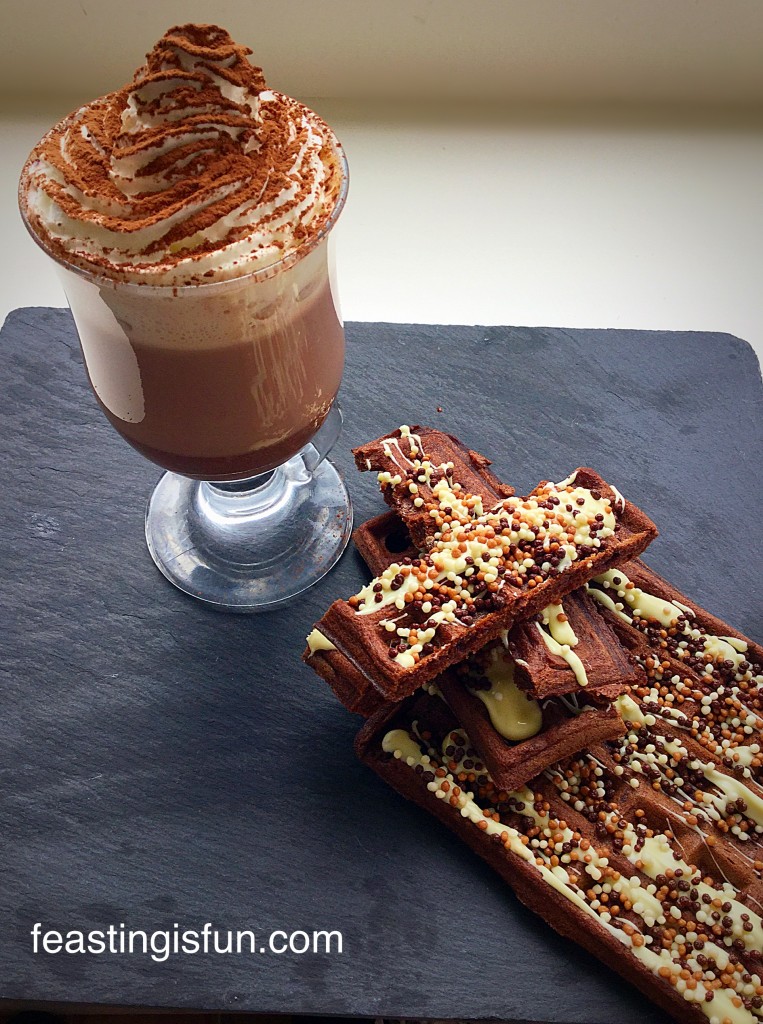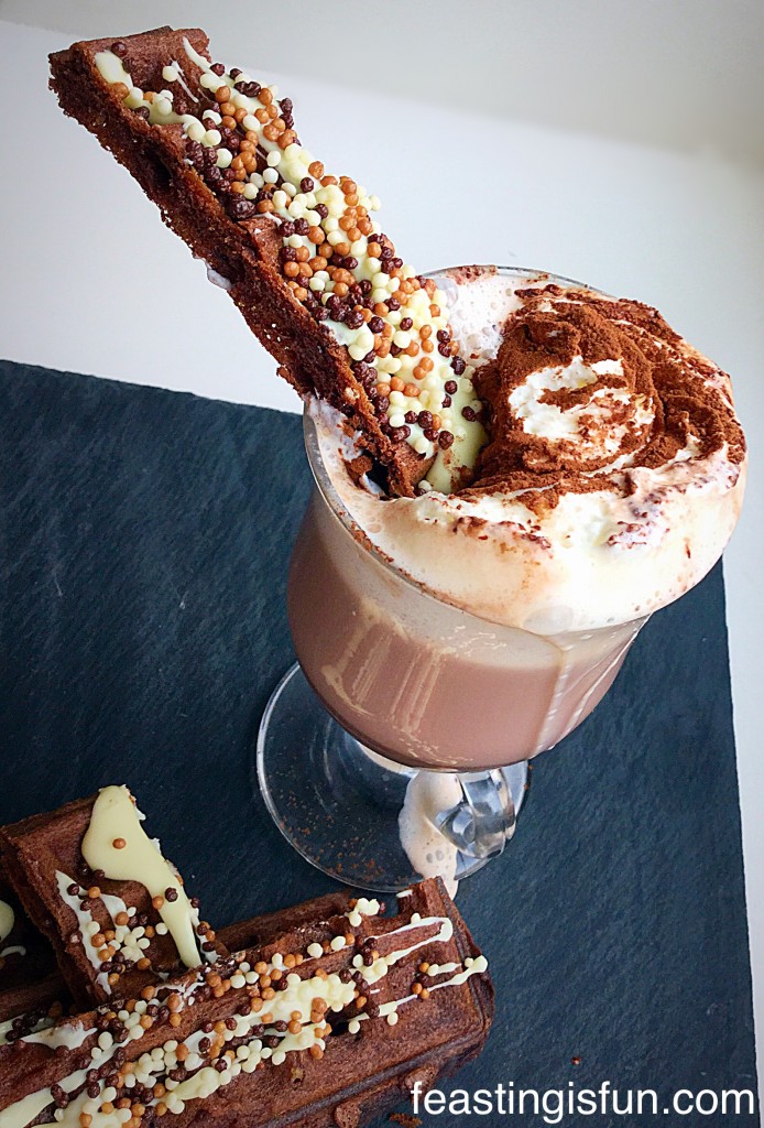 It’s still so cold even though it’s now March. Rather than shivering with cold I suggest a better way to warm up. A rich and creamy hot chocolate with Chocolate Dunking Waffles alongside.